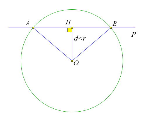 3. если $d<R$, то прямая пересекает окружность в двух точках.