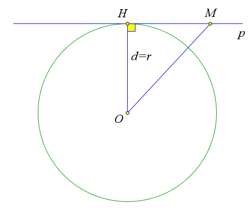 Прямая $p$ и окружность не имеют других общих точек, так как для любой точки $M$ прямой $p$, отличной от точки $H$, $OM>OH=r$ (наклонная $OM$ больше перпендикуляра $OH$), и, следовательно, точка $M$ не лежит на окружности.