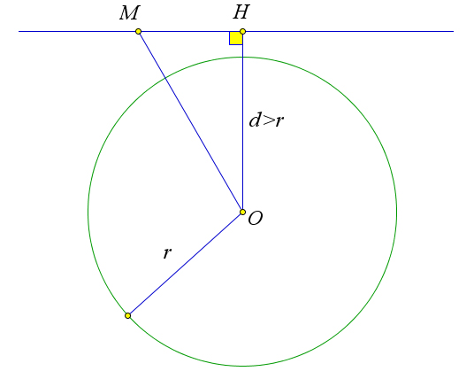 Если $d$ – это расстояние от точки $O$ до прямой $l$, а $\omega$ – окружность с центром в точке $O$ и радиусом $R$, тогда