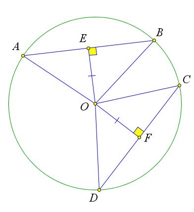 Тогда треугольники $OAE, OEB, OFD$ и $OFC$ равны по катету и гипотенузе ($OA=OB=OD=OC$, так как это радиусы).