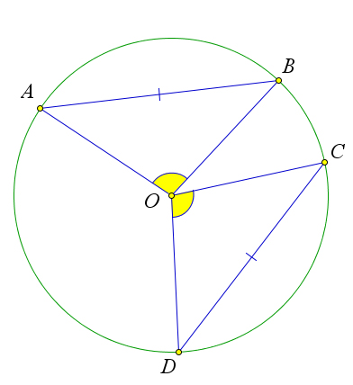 Обратно, если $AB=CD$, то $\triangle AOB=\triangle COD$ по третьему признаку равенства, следовательно, $\angle AOB=\angle COD$.