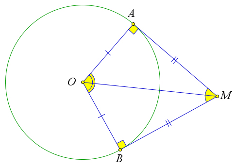 3. Если прямые, проходящие через точку $M$, касаются окружности в точках $A$ и $B$, и $AB$ пересекает $MO$ в точке $H$, то $AB\perp MO$ и $AH=HB$
