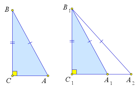Рассмотрим треугольники $ABC$ и $A_1B_1C_1$, у которых $\angle C=\angle C_1=90^\circ, AB=A_1B_1, BC=B_1C_1$.